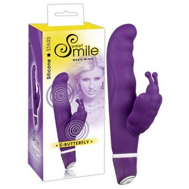 Vibrator mit Reizarm in Schmetterlingsform. Mit zwei Motoren: einer in der G-Punkt-Spitze und einer im Klitorisreizam. Die 7 Vibrationsarten sind per Knopfdruck steuerbar. Lila. 15,5 cm Gesamtlänge, Einführtiefe ca. 8,5 cm, Ø ca. 2,5 cm. Material: Silikon, phthalatfrei gemäß EU-Verordnung 1907/2006/EC. (Batterien bitte extra bestellen: 2 x Micro/AAA)