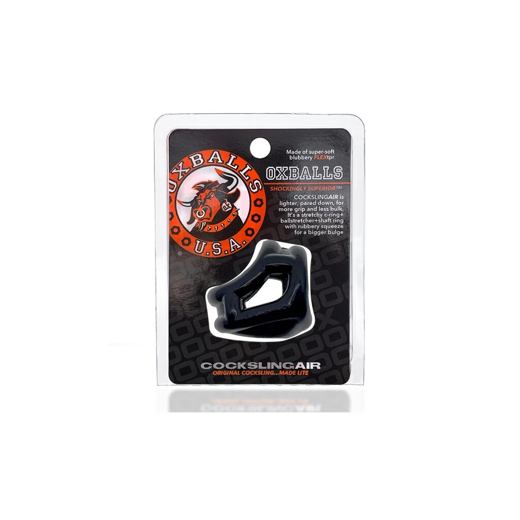 Oxballs invented the cocksling, COCKSLING AIR is a lighter, pared down version with less bulk but the same grippy bulge making ability. It’s a c-ring + a ballstretcher + a shaft ring that adds squeeze for a bigger bulge. Slings wrap the base of the shaft and balls for 360 grip that doesn’t pinch or dig.