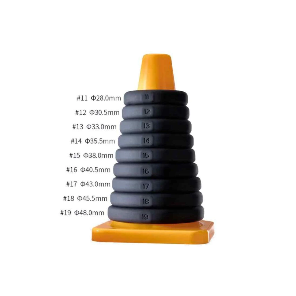 Stellen Sie sich vor, ein Fingerring wäre nur in drei Größen erhältlich, die dem Umfang einer Dime-, einer Quarter- und einer Dollar-Münze entsprechen – wie würden sie passen? Nun, bis jetzt lagen die Größen von Cockringen noch weiter auseinander als diese! Kein Wunder, dass es fast unmöglich ist, einen gut passenden Cockring zu finden.