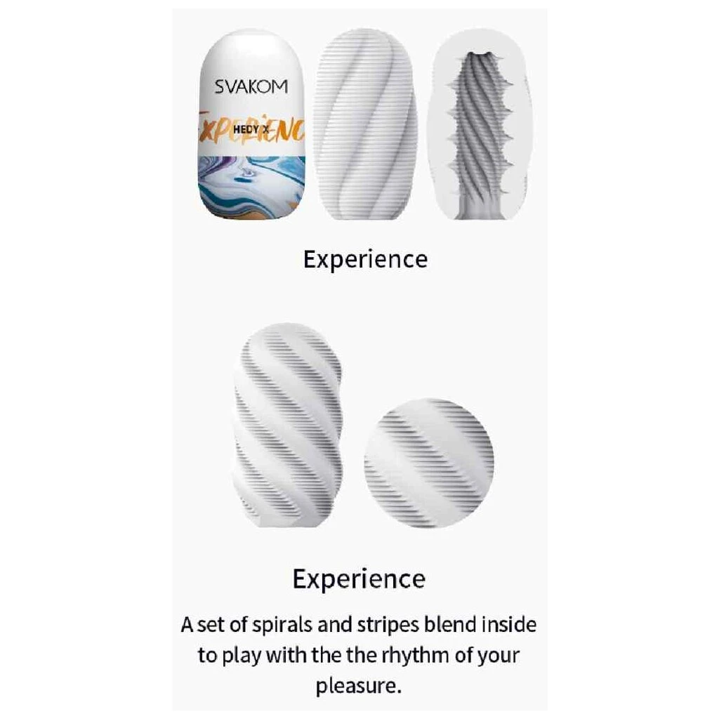 5 x herausnehmbarer Masturbator Hedy X Experience von Svakom, jeweils in der praktischen Eihülle, die auch als Gleitgelverteiler, Trockenständer und staubfreie Aufbewahrung dient. Die extrem dehnbare, seidige Masturbationshülle passt sich optimal jeder Penisgröße an und ist 5 bis 10 x nutzbar. Die ausgeprägte Rillen-Stimulationsstruktur im Inneren der Hülle sorgt für eine intensive orgasmuswirksame Massage beim Handjob.