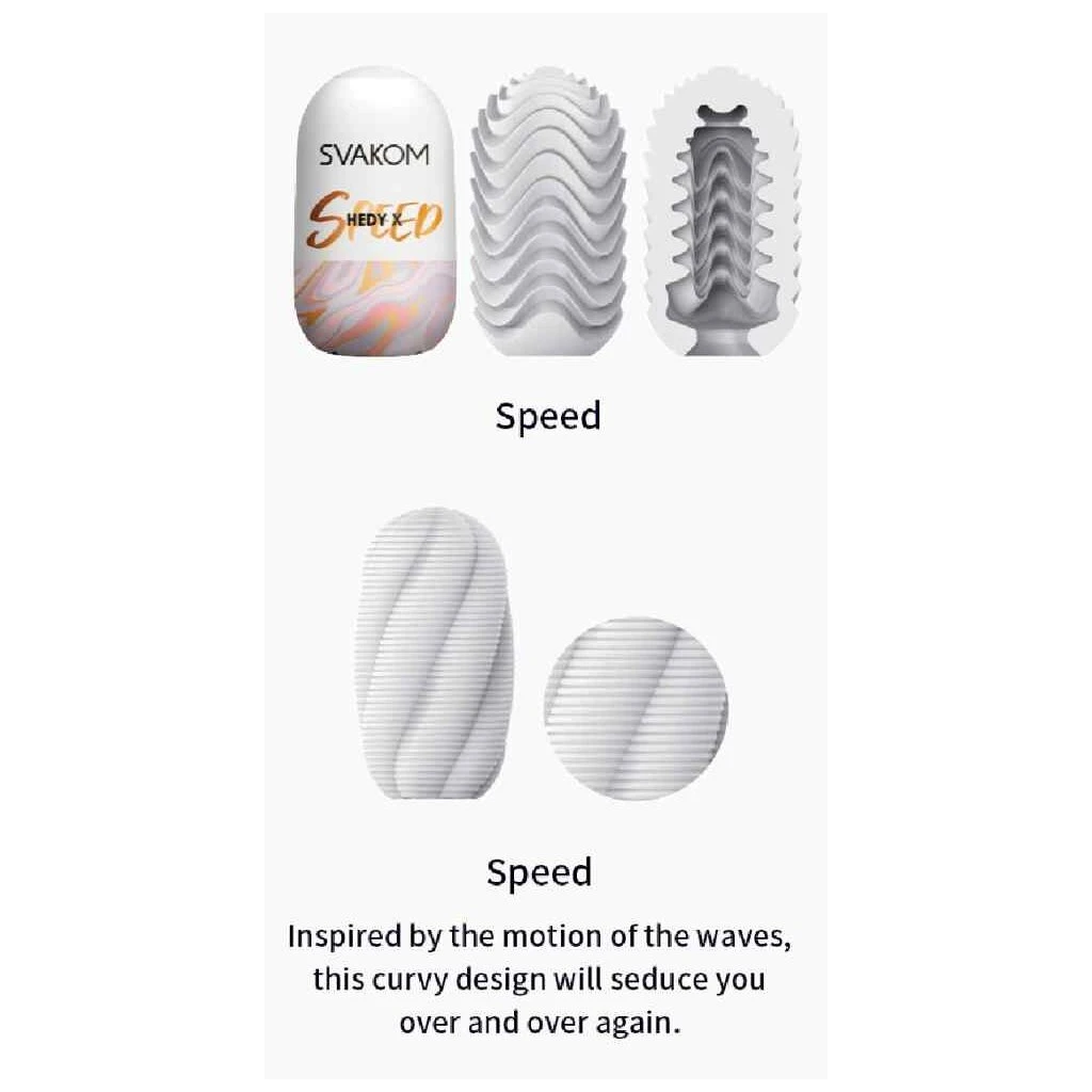 5 x herausnehmbarer Masturbator Hedy X Speed von Svakom, jeweils in der praktischen Eihülle, die auch als Gleitgelverteiler, Trockenständer und staubfreie Aufbewahrung dient. Die extrem dehnbare, seidige Masturbationshülle passt sich optimal jeder Penisgröße an und ist 5 bis 10 x nutzbar. Die ausgeprägte Lamellen-Stimulationsstruktur im Inneren der Hülle sorgt für eine intensive orgasmuswirksame Massage beim Handjob.