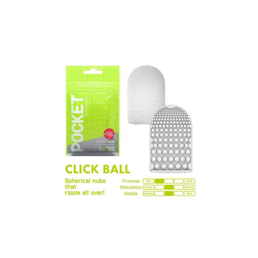 Einmal-Masturbator Pocket Click Ball von Tenga mit Kugelnoppen-Reizstruktur im Inneren. Diskret verpackt im Taschenformat-Tütchen – perfekt für unterwegs. Die ultra flexible, extrem dünne Masturbator-Sleeve wird zusammen beim Handjob mit dem beiliegenden Gleitgel verwendet. Die stark dehnbare Sleeve passt für alle Penisgrößen.