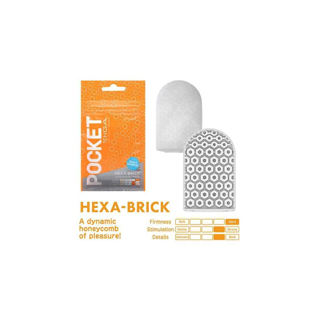 Einmal-Masturbator Pocket Hexa-Brick von Tenga mit Waben-Reizstruktur im Inneren. Diskret verpackt im Taschenformat-Tütchen – perfekt für unterwegs. Die ultra flexible, extrem dünne Masturbator-Sleeve wird zusammen beim Handjob mit dem beiliegenden Gleitgel verwendet. Die stark dehnbare Sleeve passt für alle Penisgrößen.