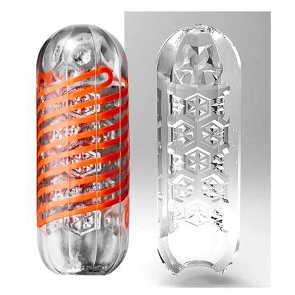 Transparenter, wiederverwendbarer Masturbator mit integrierter Spule, die bei Penetration den Masturbator ins Drehen versetzt (Internal Coil Mechanism). Ausgeprägt reizstrukturierter Lustkanal.