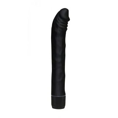 Für fantasievolle Vorspiele!Schwarzer ABS-Vibrator mit Polyurethanüberzug. In leicht geäderter und gebogener Penisform. Vibration stufenlos verstellbar. Gesamtlänge 19 cm. Ø 2 – 2,9 cm.