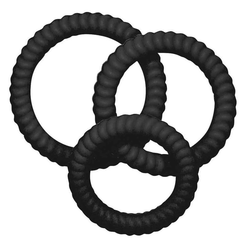 3 Penisringe mit Rillenstruktur mit unterschiedlichen Durchmessern (2,6, 3,0 und 3,5 cm). Auch ideal zur Hoden-Schnürung. Einzeln oder in Kombination zu verwenden. Material: Silikon.