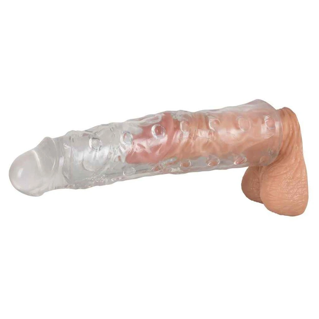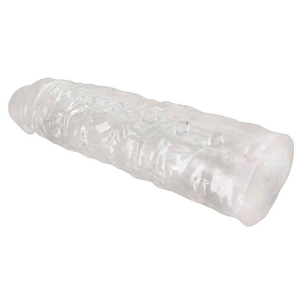 Genoppte und geäderte Penishülle – extra lang (individuell kürzbar). In der Eichel gefüllt, um den Penis zu verlängern. Transparent.Außenlänge ca. 22 cm, Ø 3,8-5 cm. Innenlänge 18 cm, Ø 3,7 cm. Material: TPE.